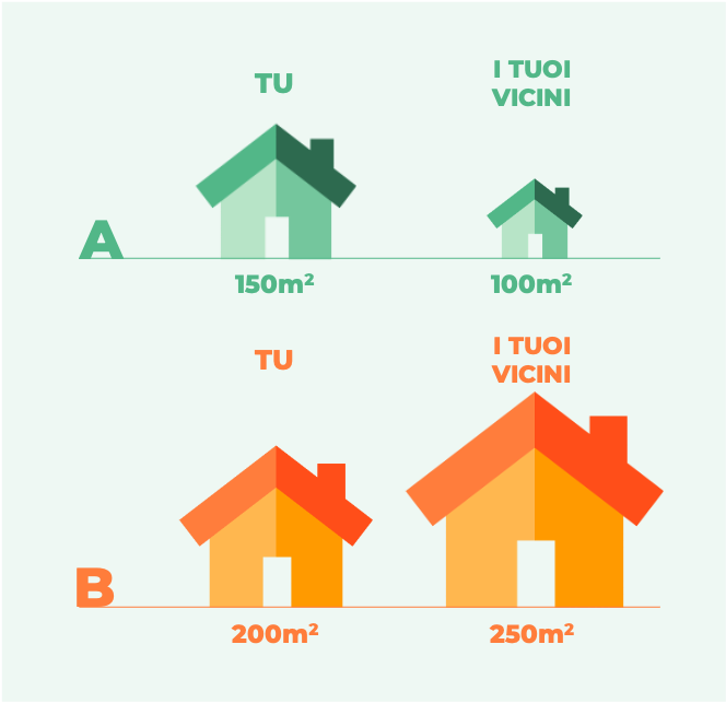 Et voila! Una persona perfettamente razionale guarderebbe solo la parte sinistra dello schema sopra, scegliendo la casa in base alla dimensione assoluta; tutte le persone che, invece, esistono davvero scelgono confrontando le opzioni con qualcosa che ci aiuta a scegliere: nell'esercizio le case dei nostri vicini. Nella situazione A il delta tra noi e i vicini è in nostro favore, nel caso B è contro.