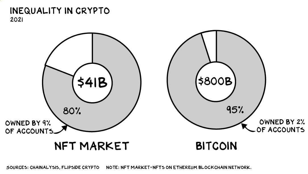 Non è assolutamente vero che è decentralizzato: il 95% di tutto il valore di bitcoin (>$800 miliardi) è in mano al 2% degli account, e il potere è solo accentrato nelle mani di enti diversi da quelli istituzionali, come ad esempio OpenSea che controlla il 97% del mercato NFT, Coinbase, Binance, e le altre grandi piattaforme di compravendita di crypto. Questo comporta che...