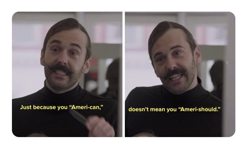 Ovviamente non stiamo parlando della libertà del tipo sconosciuto in Korea Del Nord, ma di quella libertà che vive in quella zona grigia notoriamente descritta nel concetto "la mia libertà finisce dove inizia la tua", che è solitamente il motivo per cui esistono (dovrebbero esistere) le leggi: tutelare i diritti di chi altrimenti vedrebbe questo confine calpestato (volevo scrivere "i più deboli" ma mi suonava un po' troppo Zorro). Per dirla con Jonathan Van Ness: "il fatto che tu possa, non vuol dire che dovresti."